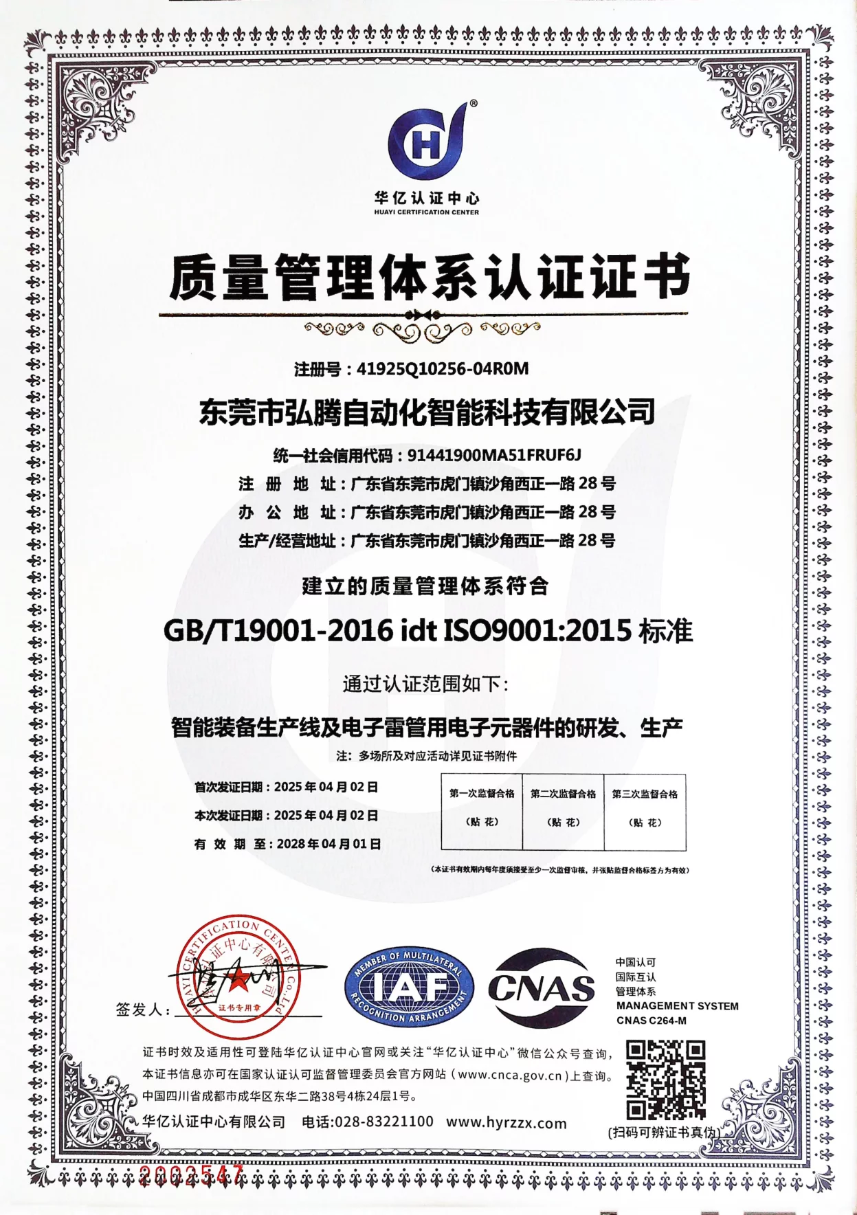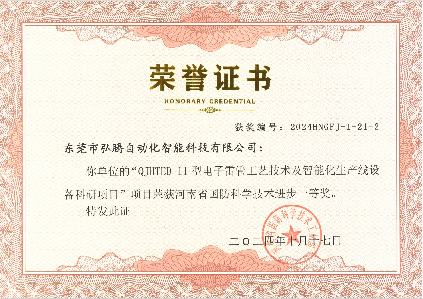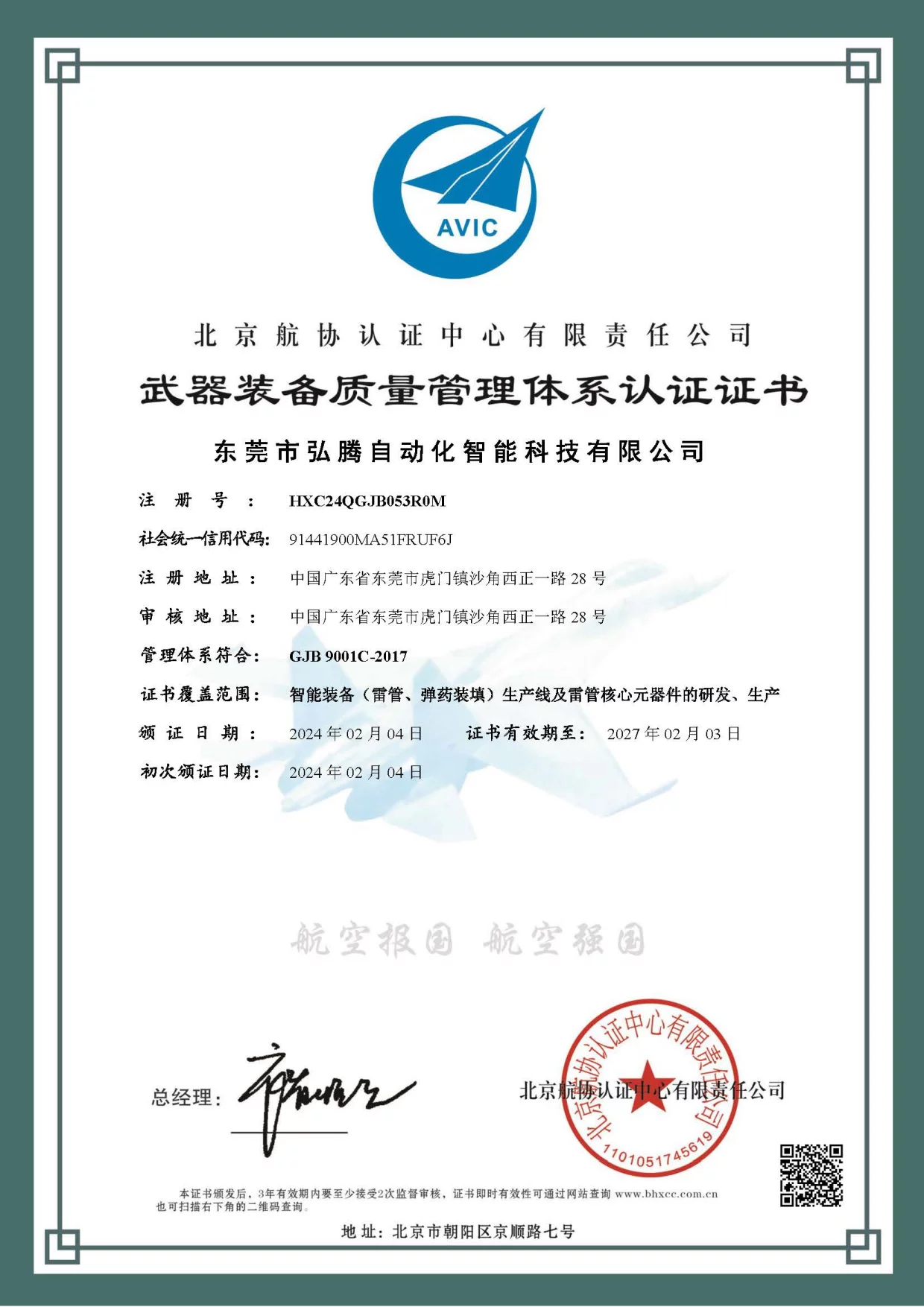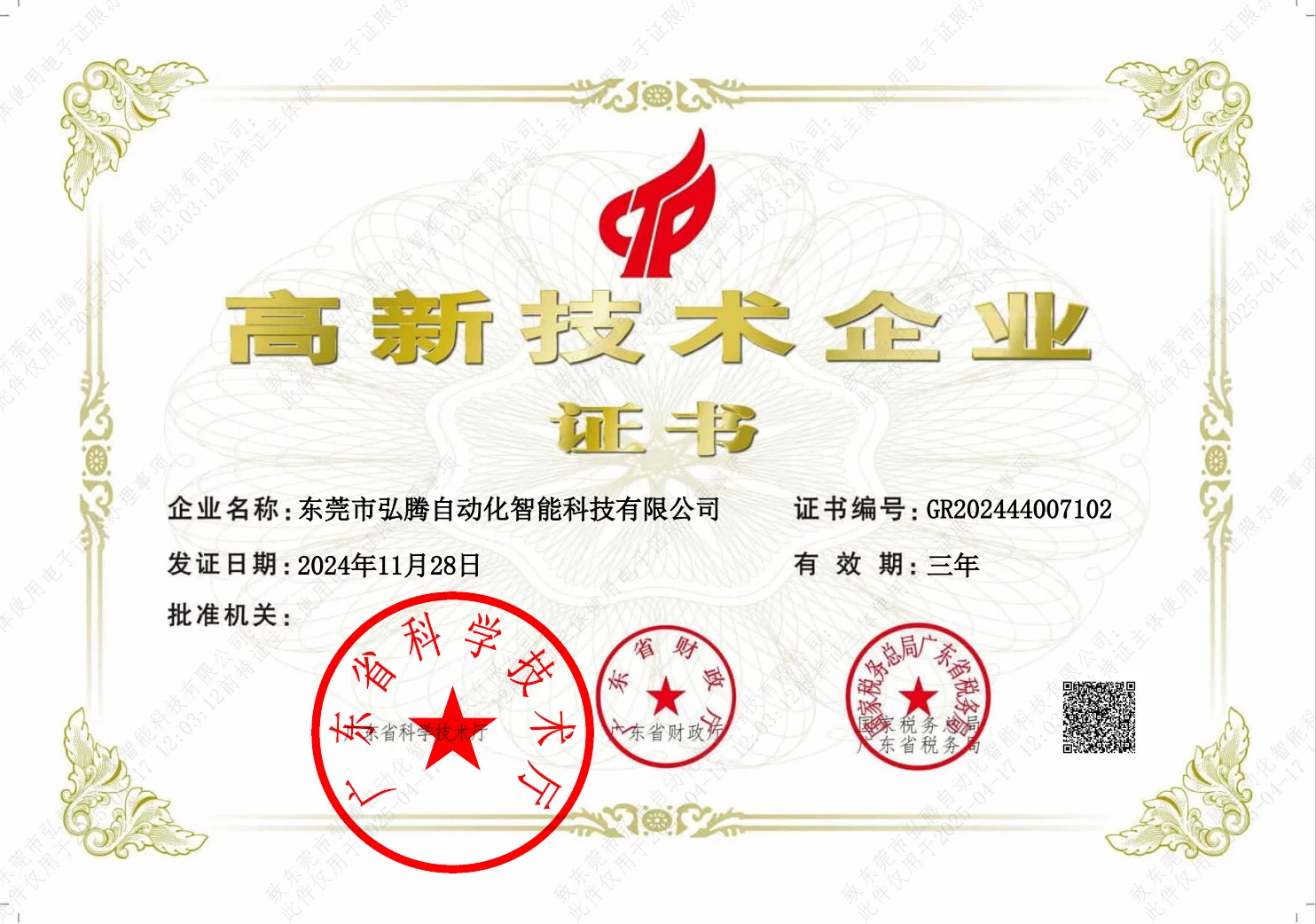 东莞市弘腾自动化智能科技有限公司是一家集科研、设计、生产、销售和服务为一体的火工品智能装备集成服务商。公司现有员工110人,其中研发设计工程师团队65人,专注于电子雷管、弹、药、点火元件等先进生产技术及工艺研究,产品广泛应用于民用爆破、军事、航天和烟火等领域,主要产品包括:新型电子雷管全自动生产线、无人化塑态装药生产线、火工品无人化装配生产线、烟花生产线、电子雷管芯片元器件、火工品检测设备、工业数字孪生系统等,已申请专利110余项,为用户提供高端、稳定、可靠的自动化解决方案。弘腾坚持“为火工品行业零伤亡贡献力量”的企业使命,以研发创新为动力,不断探索新方法、新技术的发展战略,致力于打造火工品行业极具科技创新影响力品牌。